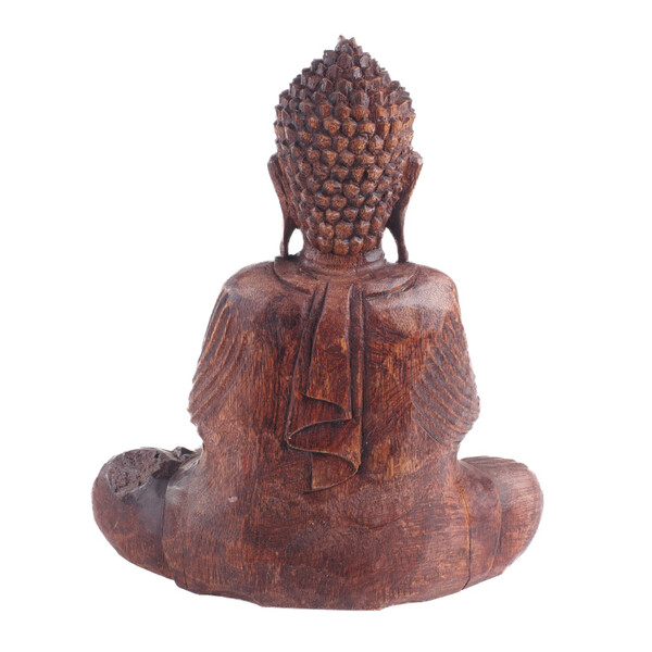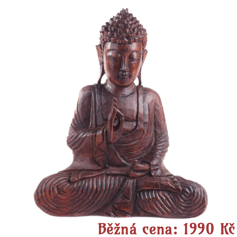 Dřevěné sochy Buddhy zaujímají v buddhistickém umění zvláštní místo. Vyřezané ze štědrosti přírody vyzařují teplo a klid. Forma soch, držení těla a gesta rukou, znamé jako mudry, mají specifické významy. Spojení palce a ukazováčku do kruhu, přičemž ostatní tři prsty zůstávají natažené, se nazývá Vitarka mudra. Je gestem intelektuálního diskursu, vzdělávání a předávání moudrosti. Kruh zde představuje nepřetržitý tok energie symbolizující nekonečný cyklus výuky a učení. Dlaň směřuje ven, což znamená otevřenost a akt komunikace. Symbolickou váhu má i samotný materiál - dřevo. V mnoha kulturách představuje růst, transformaci a spojení s přírodou. Přirozené nedokonalosti dodávají každé soše charakter a osobitost.