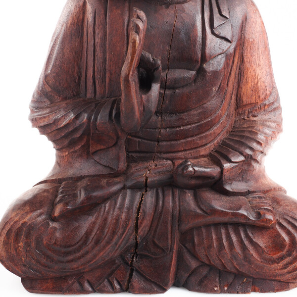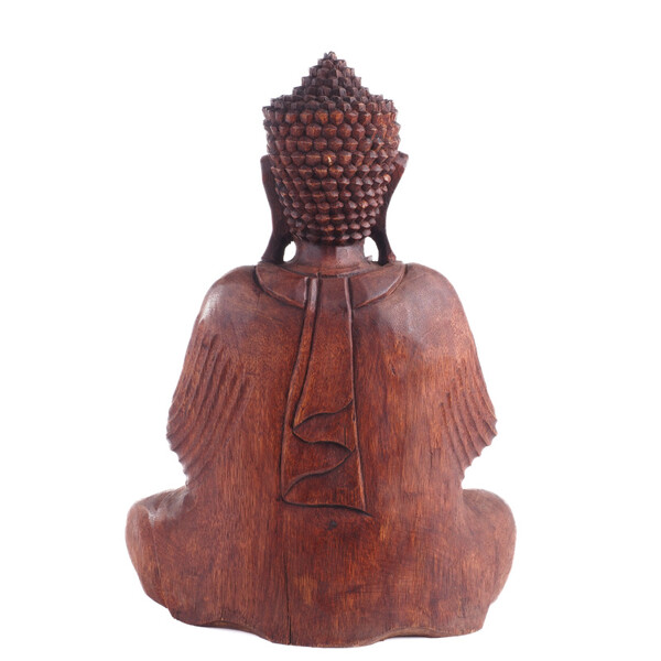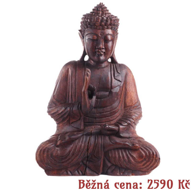 Dřevěné sochy Buddhy zaujímají v buddhistickém umění zvláštní místo. Vyřezané ze štědrosti přírody vyzařují teplo a klid. Forma soch, držení těla a gesta rukou, znamé jako mudry, mají specifické významy. Spojení palce a ukazováčku do kruhu, přičemž ostatní tři prsty zůstávají natažené, se nazývá Vitarka mudra. Je gestem intelektuálního diskursu, vzdělávání a předávání moudrosti. Kruh zde představuje nepřetržitý tok energie symbolizující nekonečný cyklus výuky a učení. Dlaň směřuje ven, což znamená otevřenost a akt komunikace. Symbolickou váhu má i samotný materiál - dřevo. V mnoha kulturách představuje růst, transformaci a spojení s přírodou. Přirozené nedokonalosti dodávají každé soše charakter a osobitost.