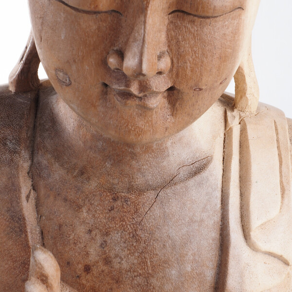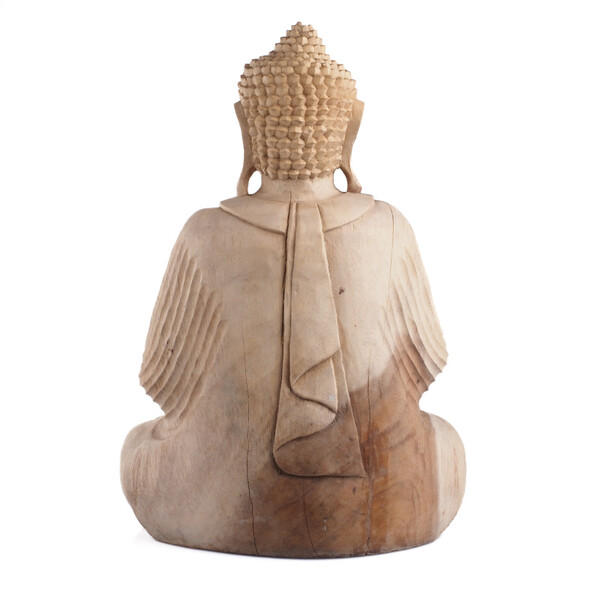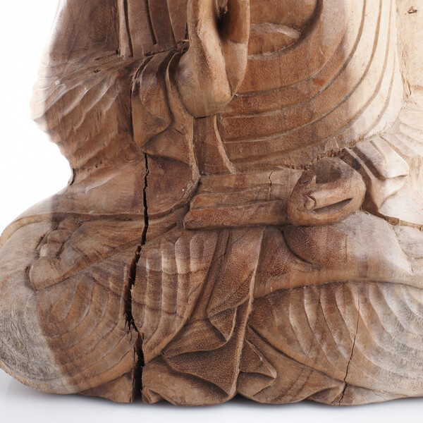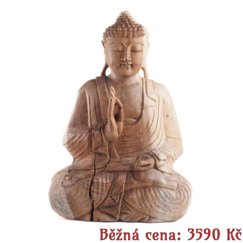 Dřevěné sochy Buddhy zaujímají v buddhistickém umění zvláštní místo. Vyřezané ze štědrosti přírody vyzařují teplo a klid. Forma soch, držení těla a gesta rukou, znamé jako mudry, mají specifické významy. Spojení palce a ukazováčku do kruhu, přičemž ostatní tři prsty zůstávají natažené, se nazývá Vitarka mudra. Je gestem intelektuálního diskursu, vzdělávání a předávání moudrosti. Kruh zde představuje nepřetržitý tok energie symbolizující nekonečný cyklus výuky a učení. Dlaň směřuje ven, což znamená otevřenost a akt komunikace. Symbolickou váhu má i samotný materiál - dřevo. V mnoha kulturách představuje růst, transformaci a spojení s přírodou. Přirozené nedokonalosti dodávají každé soše charakter a osobitost.