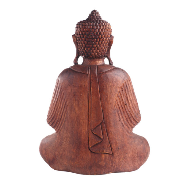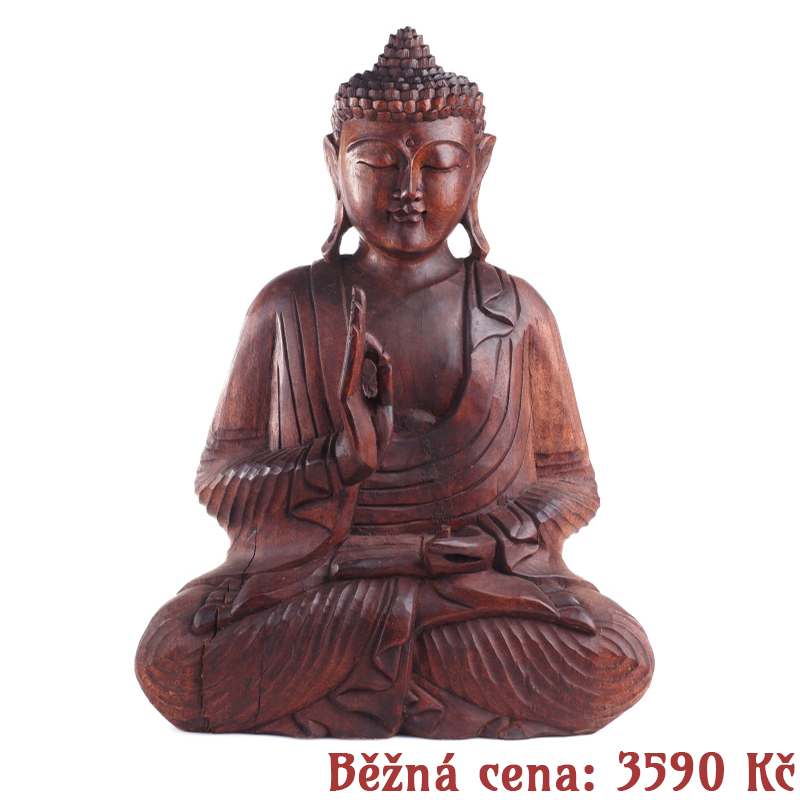 Dřevěné sochy Buddhy zaujímají v buddhistickém umění zvláštní místo. Vyřezané ze štědrosti přírody vyzařují teplo a klid. Forma soch, držení těla a gesta rukou, znamé jako mudry, mají specifické významy. Spojení palce a ukazováčku do kruhu, přičemž ostatní tři prsty zůstávají natažené, se nazývá Vitarka mudra. Je gestem intelektuálního diskursu, vzdělávání a předávání moudrosti. Kruh zde představuje nepřetržitý tok energie symbolizující nekonečný cyklus výuky a učení. Dlaň směřuje ven, což znamená otevřenost a akt komunikace. Symbolickou váhu má i samotný materiál - dřevo. V mnoha kulturách představuje růst, transformaci a spojení s přírodou. Přirozené nedokonalosti dodávají každé soše charakter a osobitost.