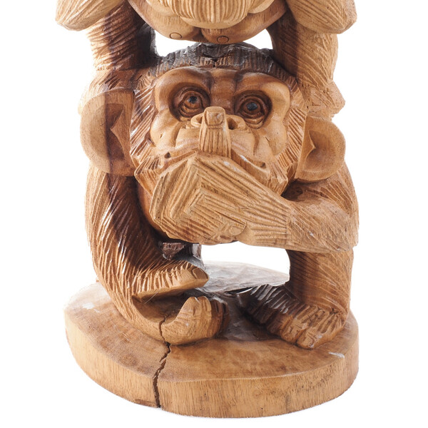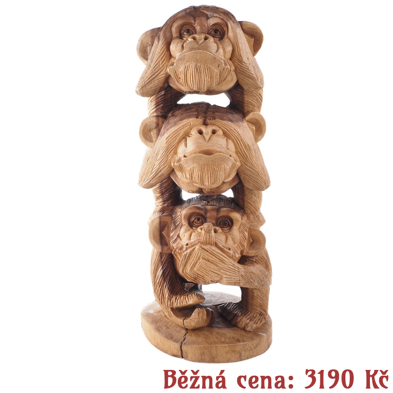 Tři moudré opice, tradičně interpretovány jako "nevidím zlo, neslyším zlo, nemluvím zlo", jsou v buddhismu vyjádřením etické zásady nekonání zla a neubližování, a zároveň odmítnutí nesprávného chování druhých. Vyzývají, abychom se nezabývali zlými myšlenkami a udrželi si tak vnitřní mír a pozitivitu. Učí nás osobní odpovědnosti a vědomému rozhodnutí nenechat se zasáhnout a ovlivnit negativitou. Jejich znázornění je symbolem moudrosti, duchovního klidu a zdrženlivosti od špatnosti. Symbolickou váhu má i samotný materiál - dřevo. V mnoha kulturách představuje růst, transformaci a spojení s přírodou. Přirozené nedokonalosti dodávají každé soše charakter a osobitost.