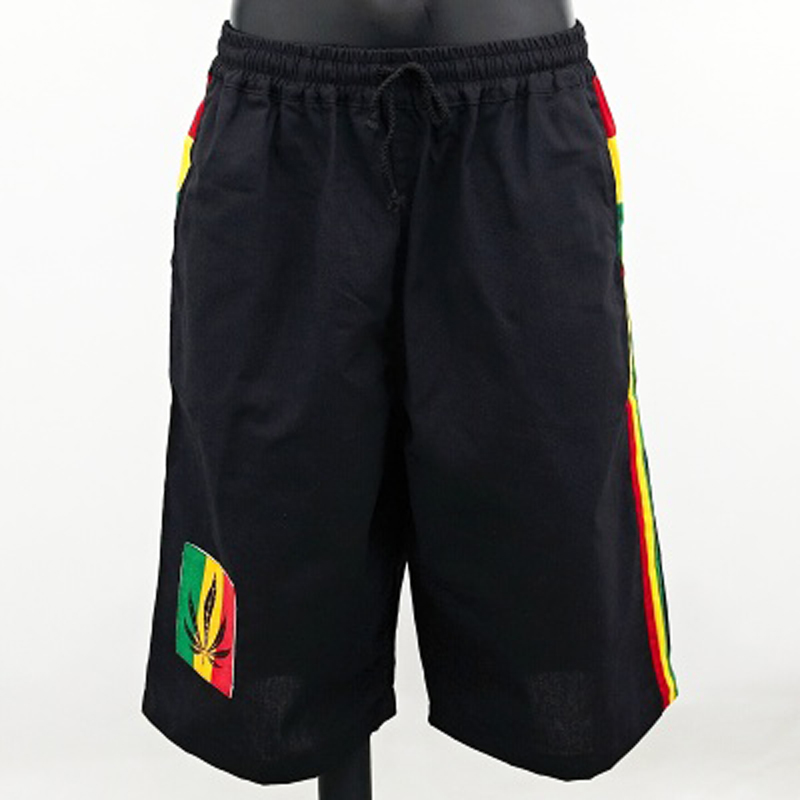 Černé pánské bermudy s motivem černého konopného listu na rasta trikolóře, zdobené rasta stužkou.