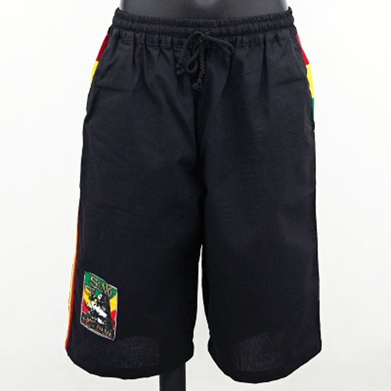 Černé pánské bermudy s motivem zpívajícího Boba Marleye na rasta nášivce, zdobené rasta stužkou.