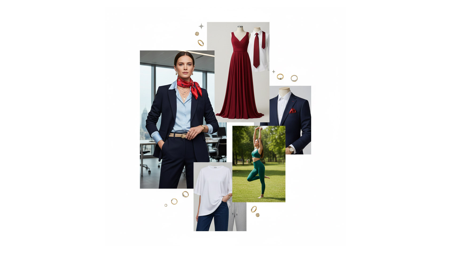 Když to shrneme; co se týká práce, kariéry, je vhodné zvolit na jednání světle modrou nebo bílou košili (šaty) se zlatými doplňky a tmavěmodrý oblek s červeným doplňkem. Pro společenské události, resp. přitažlivost a úspěch, se doporučují červené šaty nebo kravaty. A pro zdraví, oživení, potom zelené oblečení s kombinací bílé barvy.