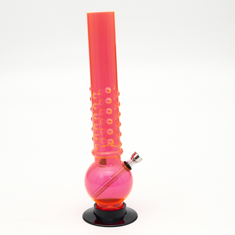 Acrylový bong Balls 30 cm v oranžové barvě zdobený kuličkami. V závislosti na dopadu světla se bong v některých úhlech může jevit jako růžový.