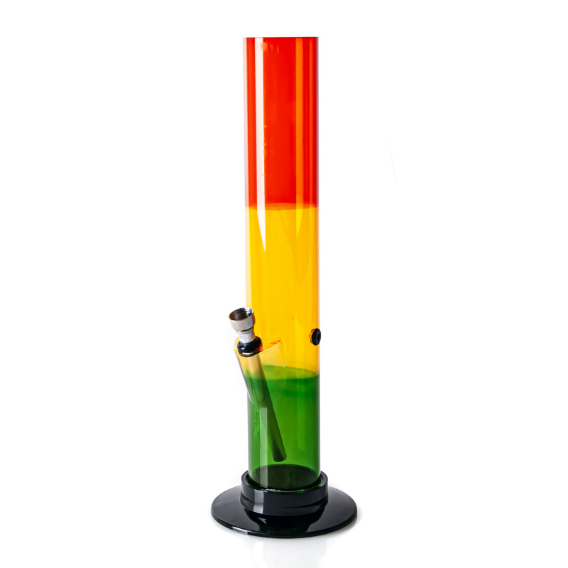 Menší odolný bong z tvrzeného plastu. Trubice bongu je vyvedena v tradiční barevné rasta kombinaci