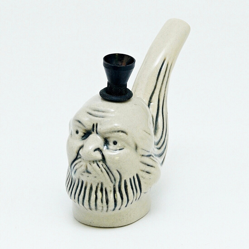 Malý bong vyrobený z keramiky s vypodobněním hlavy vousatého muže s dlouhými vlasy, s turbem.