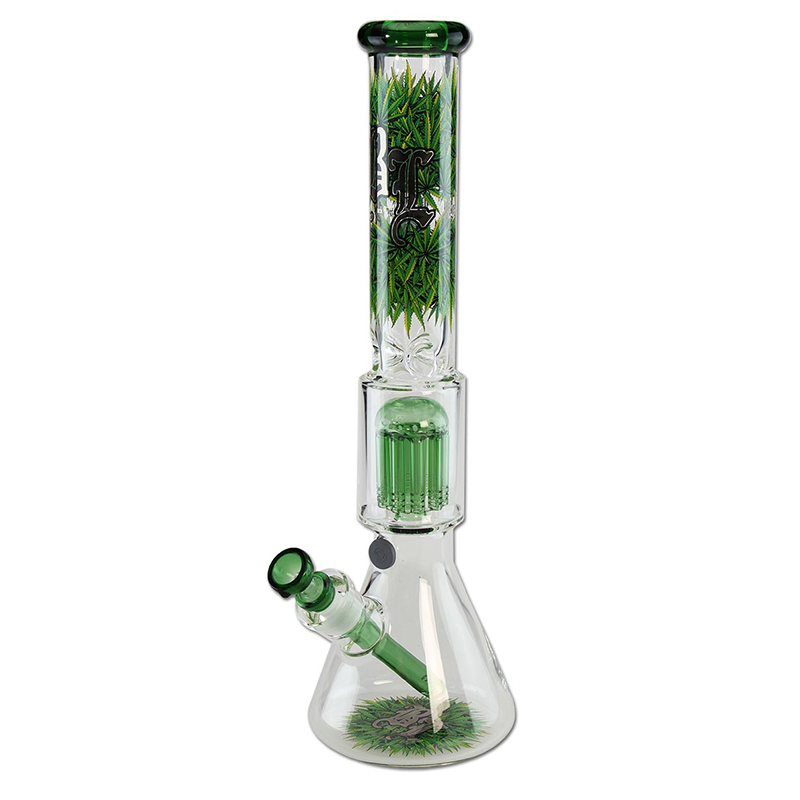 Zelená je tráva? To víme. A jsou si toho patřičně vědomi i výrobci bongu Simax Black Leaf Bush Ice Percolator, který je zelenou barvou a konopnými listy celkem slušně posetý.
