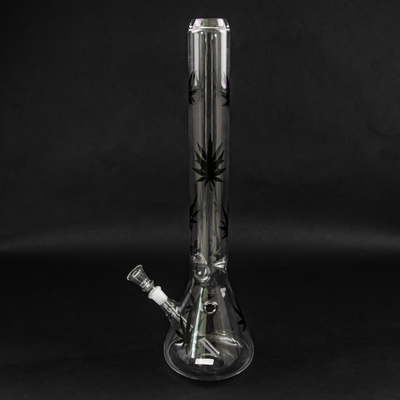 Čirý bong větší velikosti z odolného tvrzeného skla Simax zdobený motivem konopných listů.