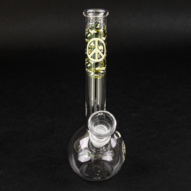 Čirý bong menší velikosti z odolného tvrzeného skla Simax zdobený motivem loga Greenpiece.