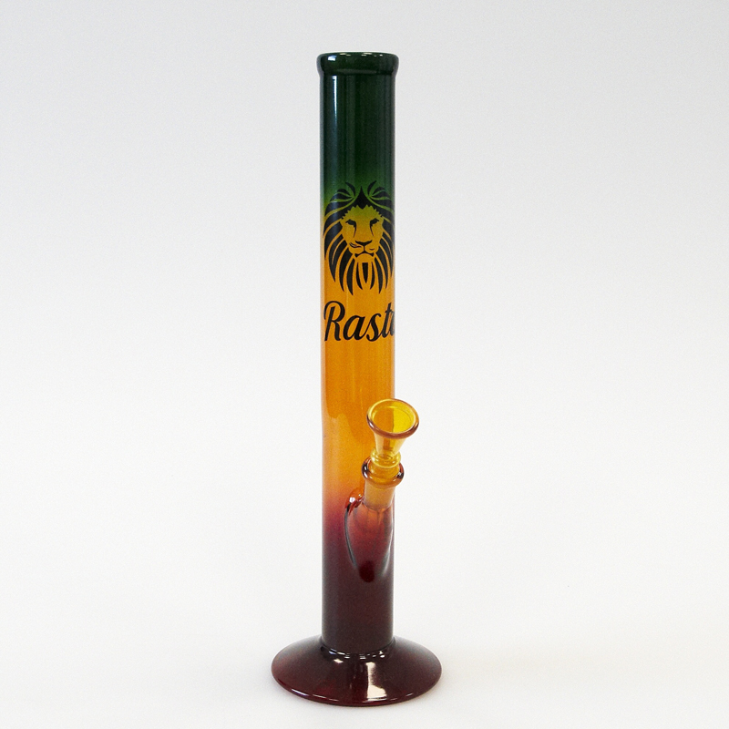 Lomený bong střední velikosti z odolného tvrzeného skla Simax. Bong je zbarvený do tradičních rasta barev