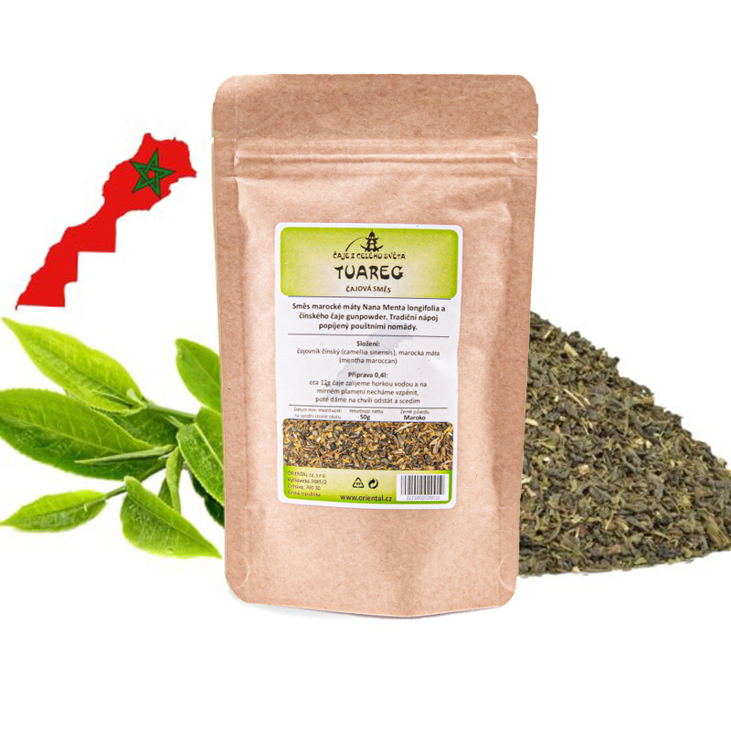 Tuareg - nápoj pouštních nomádů je složen z čaje gunpowder a Nany - marocké máty. Marocká máta příznivě působí na trávicí ústrojí, podporuje trávení. Vynikající osvěžující čaj se silnými povzbuzujícími účinky. Tuareg se pije mírně až silně slazený. Marocká máta, v tomto čaji obsazená, má navíc pozitivní účinky na lidské trávení, podporuje detoxikaci organismu a blahodárně působí na trávicí ústrojí.