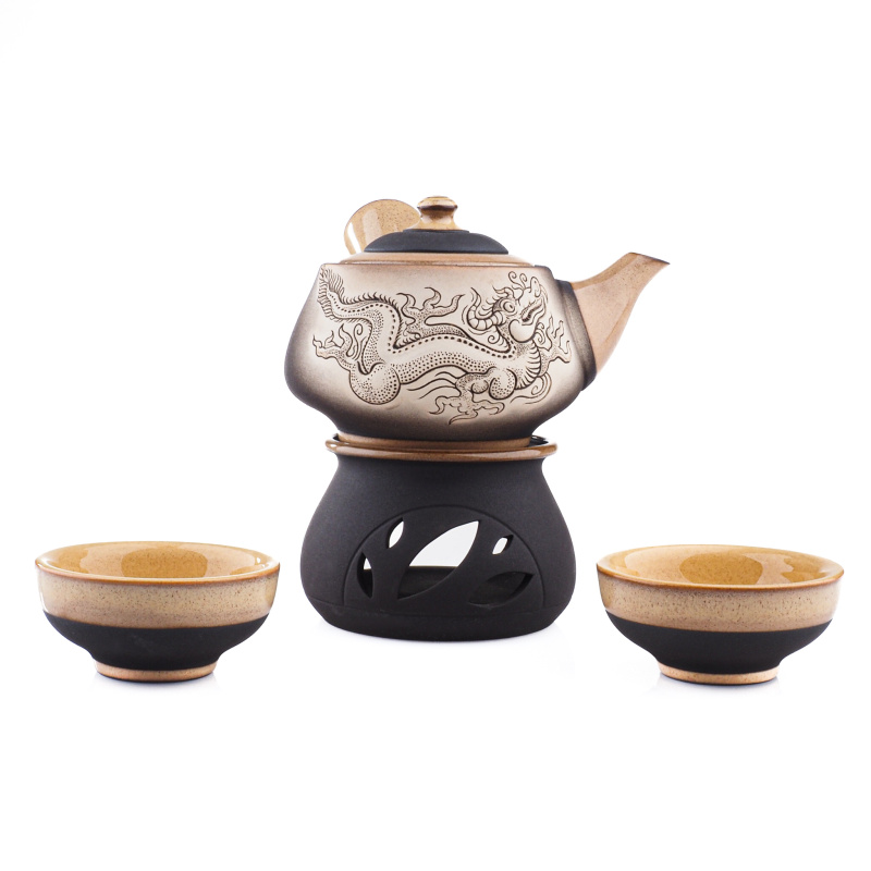 Set se skládá z konvičky o objemu 250 ml s hrubým sítem v ústí do hubičky a dvou šálků, které jsou vyrobeny z pologlazované keramiky v tmavě hnědé a béžové barvě. Na konvičce se majestátně vyjímá kresba draka na světlém podkladu - symbol síly, prosperity a štěstí. Drak dodá půvab každému okamžiku, kdy usednete k čaji, a přináší do vašeho domova dotek starodávné kultury. Speciálním prvkem soupravy je podstavec konvičky, pod který lze umístnit čajovou svíčku. Svíčka udržuje čaj teplý po celou dobu vašeho posezení, takže si můžete vychutnávat každý doušek bez spěchu.