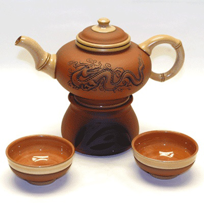 Čajová souprava Drak červená, střední velikosti - konev s vnitřním sítkem + dva šálky, objem 300 ml