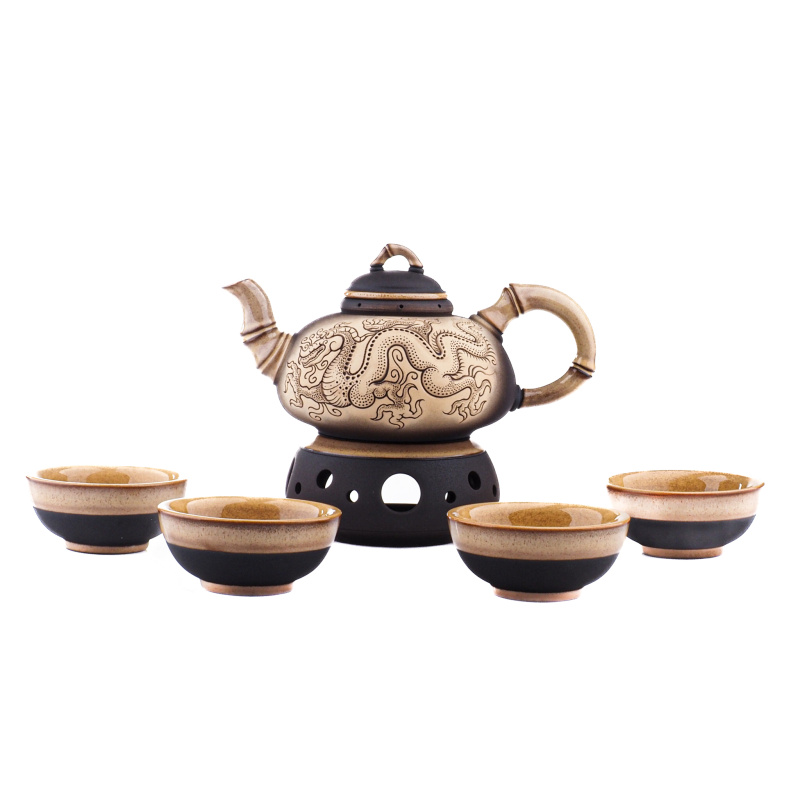 Set se skládá z konvičky o objemu 450 ml s hrubým sítem v ústí do hubičky a čtyř šálků, které jsou vyrobeny z pologlazované keramiky v tmavě hnědé a béžové barvě. Na konvičce se majestátně vyjímá kresba draka na světlém podkladu - symbol síly, prosperity a štěstí. Drak dodá půvab každému okamžiku, kdy usednete k čaji, a přináší do vašeho domova dotek starodávné kultury. Speciálním prvkem soupravy je podstavec konvičky, pod který lze umístnit čajovou svíčku. Svíčka udržuje čaj teplý po celou dobu vašeho posezení, takže si můžete vychutnávat každý doušek bez spěchu.