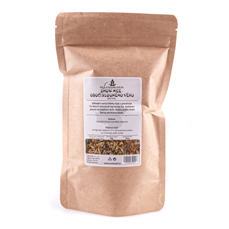Shou Mei - Obočí dlouhého věku - to je základní sorta čínského bílého čaje, pěstovaného v provincii Fu-ťien, s nízkým obsahem teinu. Název Shou mei se dá přeložit jako Starcovo obočí. Hrubší ochmýřené šedozelené lístky se sbírají ještě nedozrálé z jara. V minulosti byl tento čaj, plný přírodních antioxidantů, dodáván pouze na Císařský dvůr. Nejvíce oblíbený byl za vlády dynastie Song (960-1279 n.l.). Nálev je světle žluté barvy, delikátní chuti.