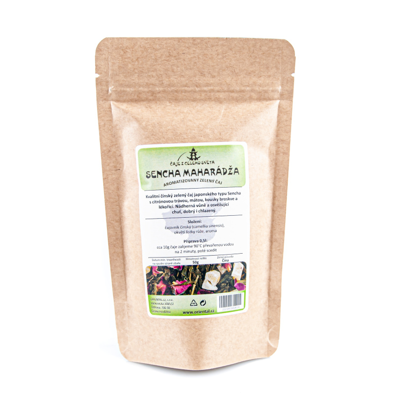 Sencha Maharádža je luxusní a chuťově vyvážená směs zeleného čaje japonského typu, ochuceného okvětními lístky růží, citronovou trávou, mátou a kousky broskví. Tento vynikající čaj je charakteristický nádhernou vůní i chutí, výborný je i chlazený.