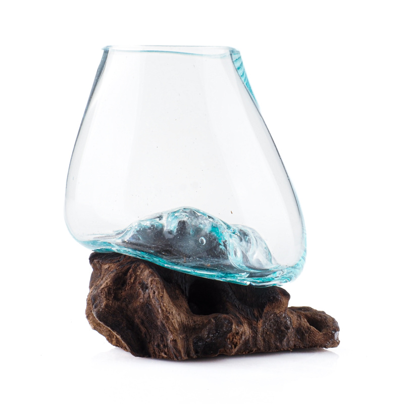 Neobyčejné spojení přírody a lidské tvořivosti v podobě skleněné dózy zasazené do neopracovaného kusu dřeva pochází z exotického ostrova Bali, kde je ručně vyráběna místními řemeslníky.