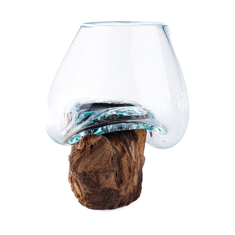 Neobyčejné spojení přírody a lidské tvořivosti v podobě skleněné dózy zasazené do neopracovaného kusu dřeva pochází z exotického ostrova Bali, kde je ručně vyráběna místními řemeslníky.
