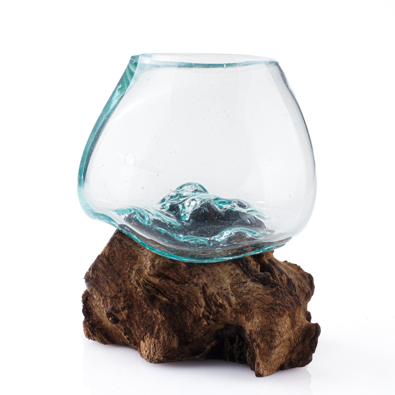 Neobyčejné spojení přírody a lidské tvořivosti v podobě skleněné dózy zasazené do neopracovaného kusu dřeva pochází z exotického ostrova Bali, kde je ručně vyráběna místními řemeslníky.