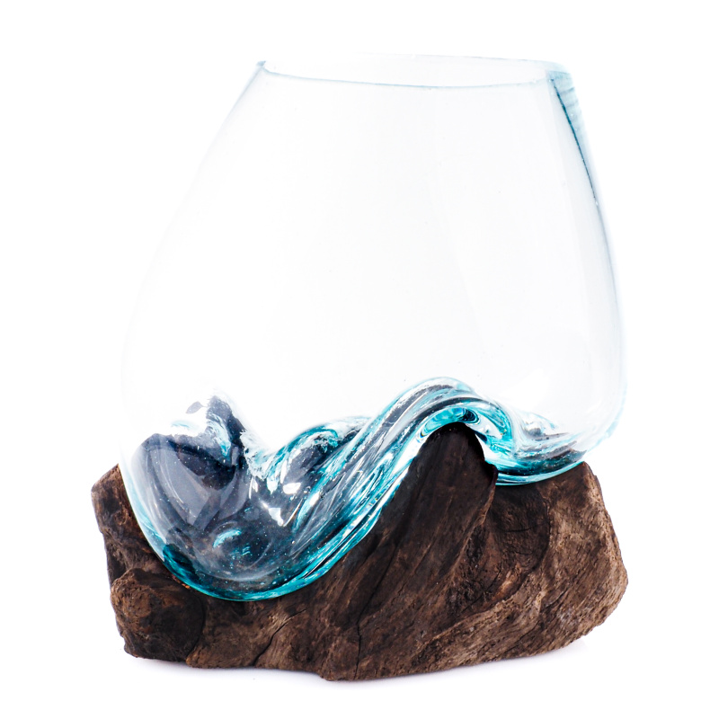 Neobyčejné spojení přírody a lidské tvořivosti v podobě skleněné dózy zasazené do neopracovaného kusu dřeva pochází z exotického ostrova Bali, kde je ručně vyráběna místními řemeslníky.