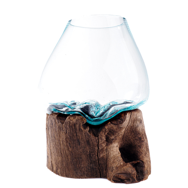 Neobyčejné spojení přírody a lidské tvořivosti v podobě skleněné dózy zasazené do neopracovaného kusu dřeva pochází z exotického ostrova Bali, kde je ručně vyráběna místními řemeslníky.