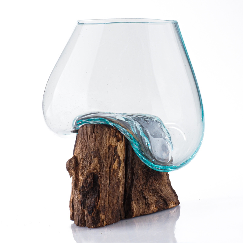Neobyčejné spojení přírody a lidské tvořivosti v podobě skleněné dózy zasazené do neopracovaného kusu dřeva pochází z exotického ostrova Bali, kde je ručně vyráběna místními řemeslníky.