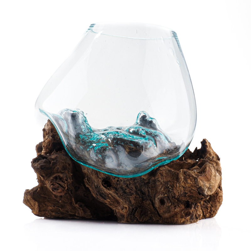 Neobyčejné spojení přírody a lidské tvořivosti v podobě skleněné dózy zasazené do neopracovaného kusu dřeva pochází z exotického ostrova Bali, kde je ručně vyráběna místními řemeslníky.