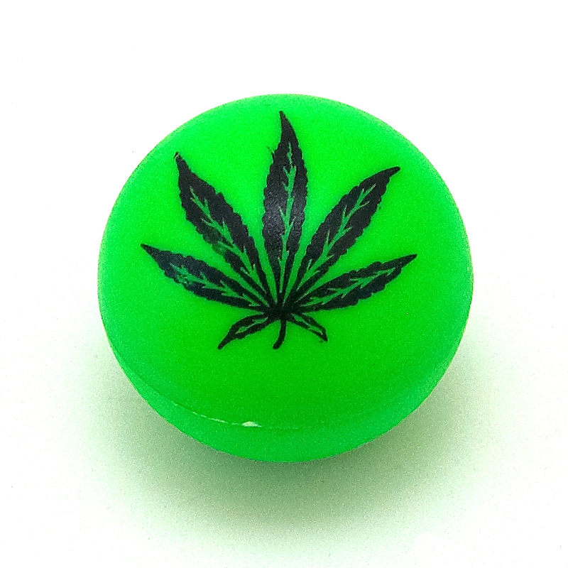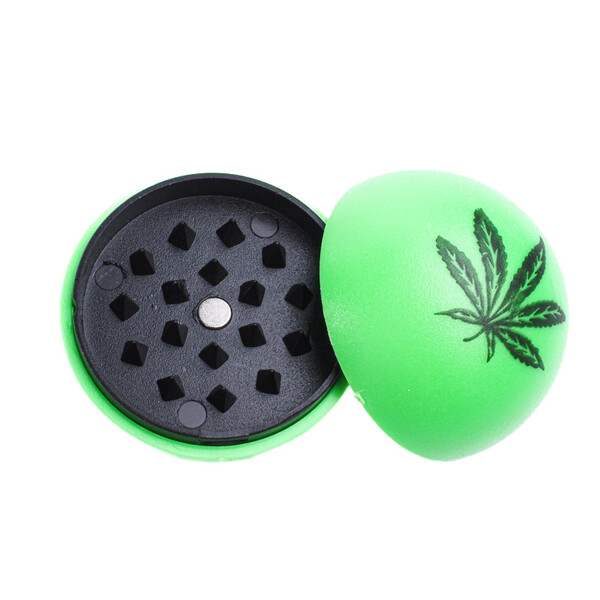 Plastová drtička ve tvaru míčku s velmi ostrými hroty a magnetickým zámkem. Drtička je zdobená motivem konopného lístku.