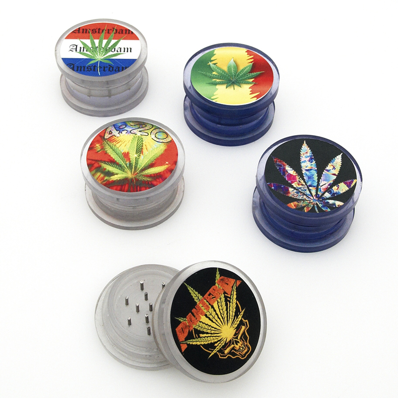Plastová drtička s kovovými hroty zdobená motivem konopného listu. Drtička je v různých barvách a v lehce odlišných provedeních - konkrétní model expedujeme podle aktuálních skladových zásob.