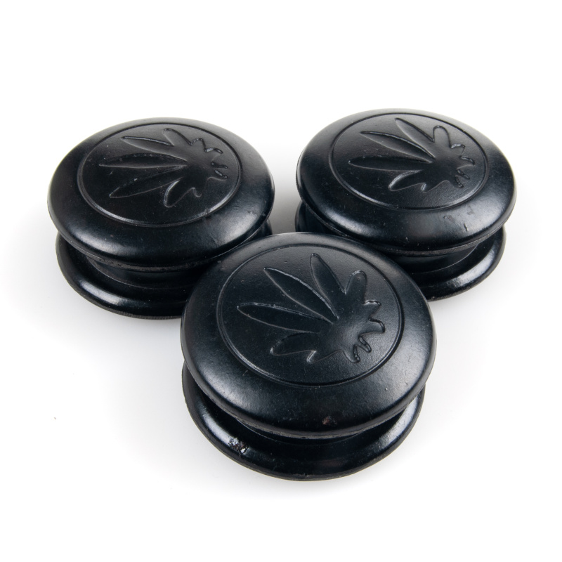 Plastová drtička s vloženými kovovými hroty zdobená motivem konopného listu. V naší nabídce je několik barevných variant těchto drtiček.