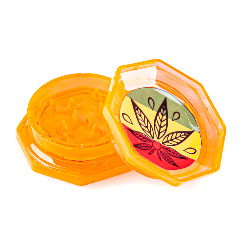 Plastová drtička s velmi ostrými hroty zdobená motivem konopného listu. V naší nabídce je několik barevných variant těchto drtiček