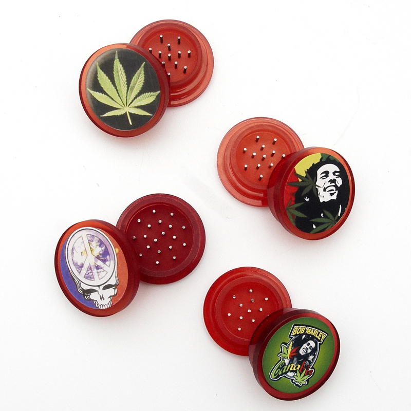 Plastová drtička v červené barvě s ostrými hroty a nejrůznějšími motivy.