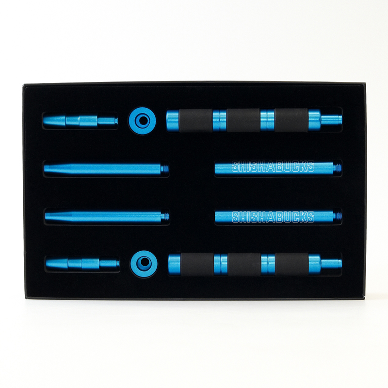 Součástí setu jsou dvě silikonové hadice se samoucpávacími rukojeťmi, konektory pro dýmky Shishabucks a univerzální konektory.