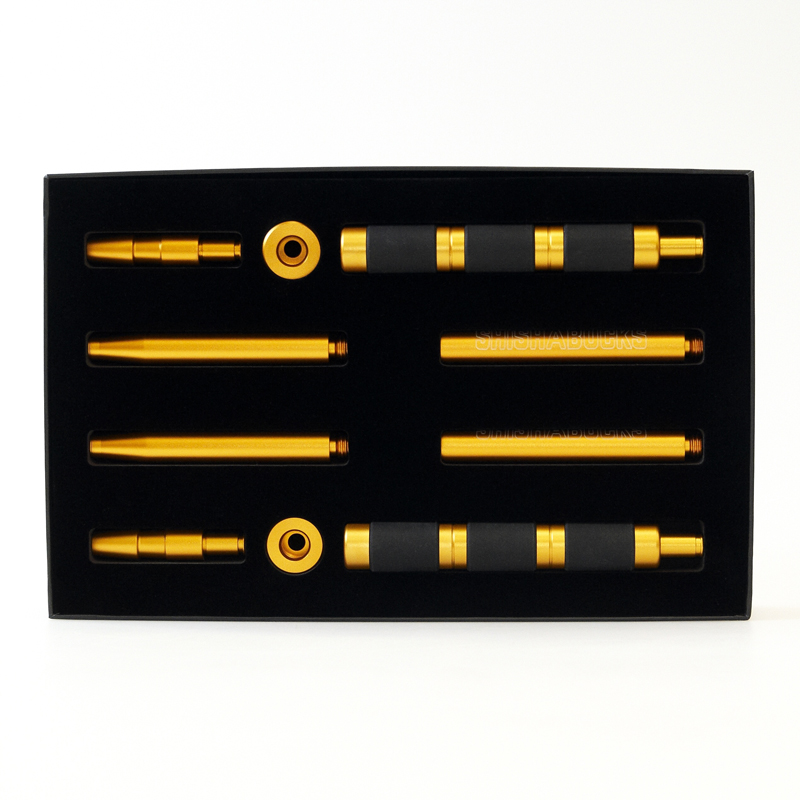Součástí setu jsou dvě silikonové hadice se samoucpávacími rukojeťmi, konektory pro dýmky Shishabucks a univerzální konektory.