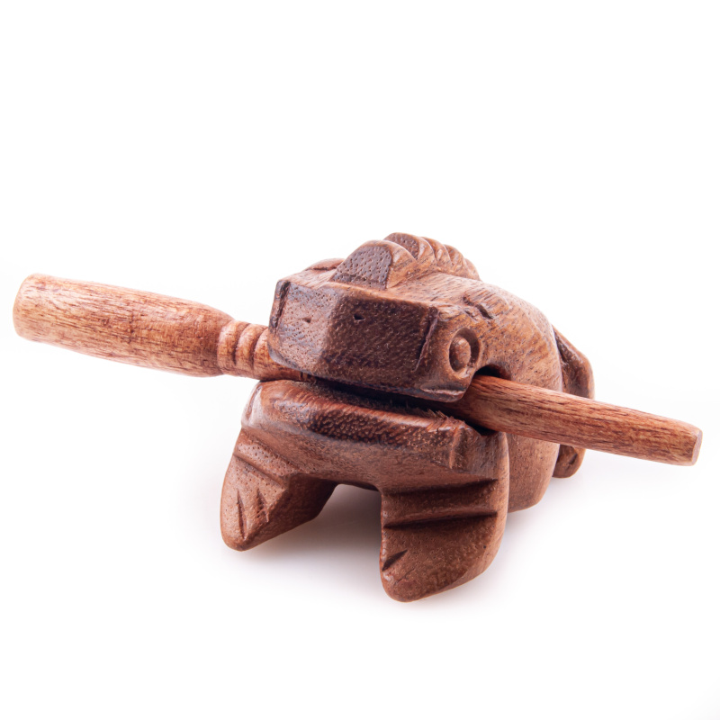 Zábavná hračka a netradiční hudební instrument zároveň. Ručně vyřezávaná žába má na zádech výstupky, které přejížděním přiloženou paličkou vyloudí veselé zvuky žabího kvákání. Úžasný nástroj pro malé i velké hračičky.