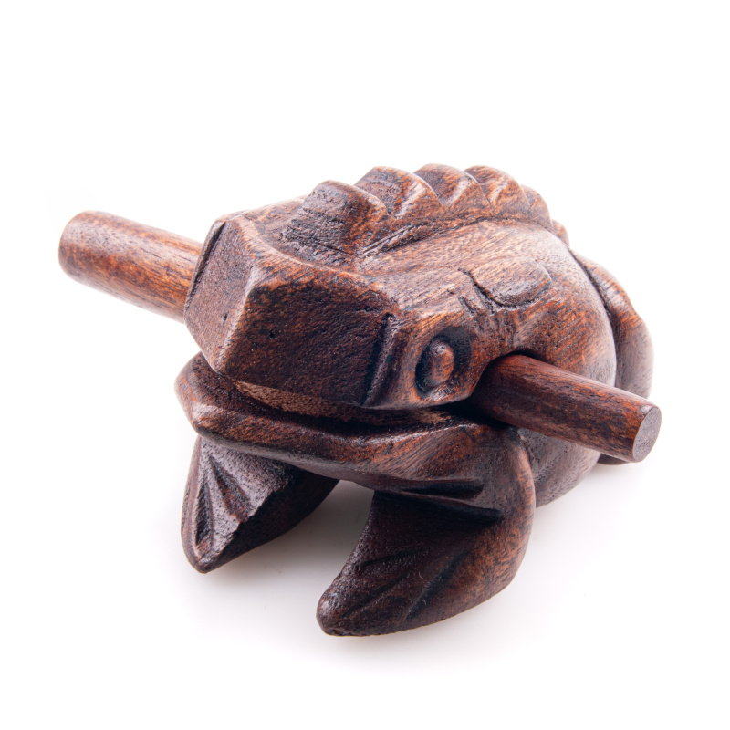 Zábavná hračka a netradiční hudební instrument zároveň. Ručně vyřezávaná žába má na zádech výstupky, které přejížděním přiloženou paličkou vyloudí veselé zvuky žabího kvákání. Úžasný nástroj pro malé i velké hračičky.