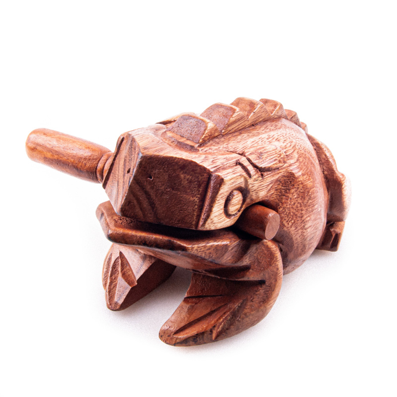 Zábavná hračka a netradiční hudební instrument zároveň. Ručně vyřezávaná žába má na zádech výstupky, které přejížděním přiloženou paličkou vyloudí veselé zvuky žabího kvákání. Úžasný nástroj pro malé i velké hračičky.