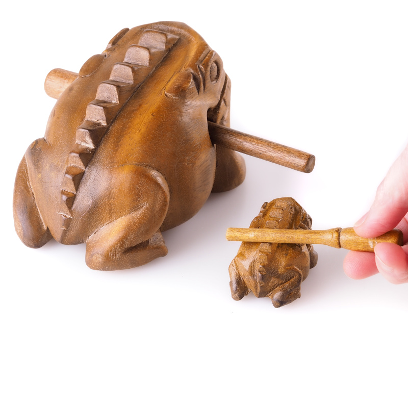 Zábavná hračka a netradiční hudební instrument zároveň. Ručně vyřezávaná žába má na zádech výstupky, které přejížděním přiloženou paličkou vyloudí veselé zvuky žabího kvákání. Úžasný nástroj pro malé i velké hračičky.