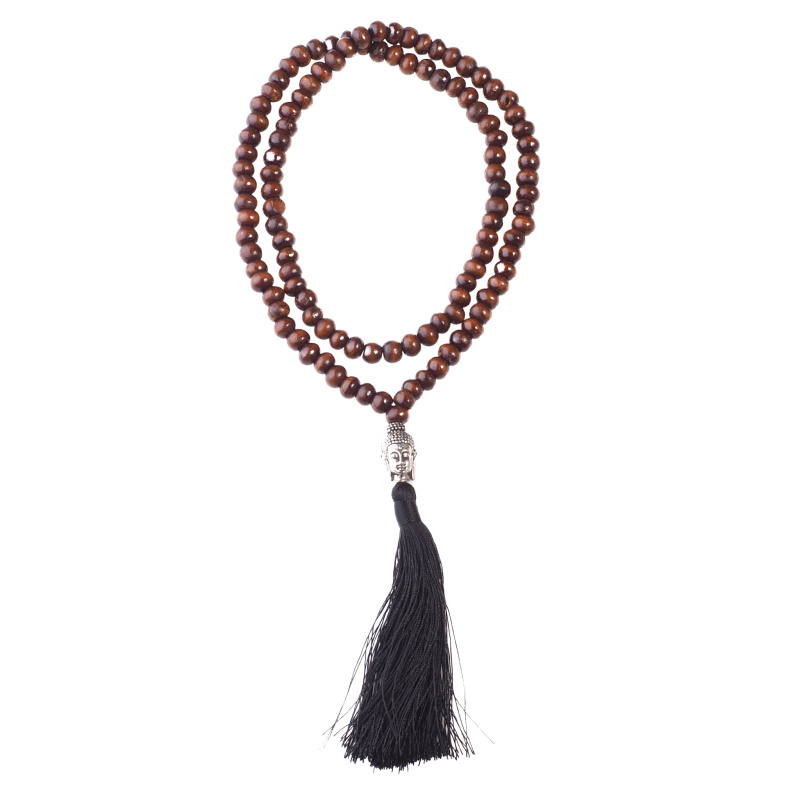 Na exotickém ostrově Bali ručně vyráběná tradiční mala z tmavých dřevěných korálků zdobená kovovým prvkem ve tvaru hlavy Buddhy a černým střapečkem.