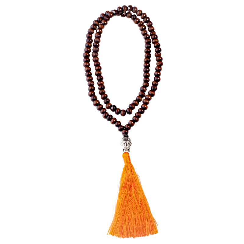 Na exotickém ostrově Bali ručně vyráběná tradiční mala z tmavých dřevěných korálků zdobená kovovým prvkem ve tvaru hlavy Buddhy a oranžovým střapečkem.