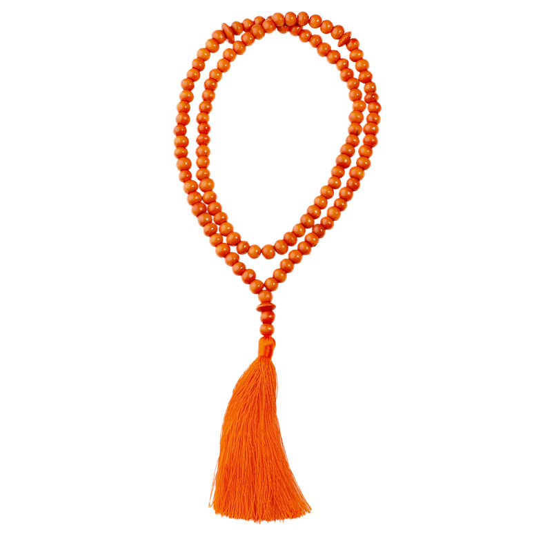 Na exotickém ostrově Bali ručně vyráběná tradiční mala z dřevěných korálků v oranžové barvě.