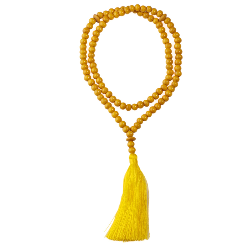 Na exotickém ostrově Bali ručně vyráběná tradiční mala z dřevěných korálků ve žluté barvě.