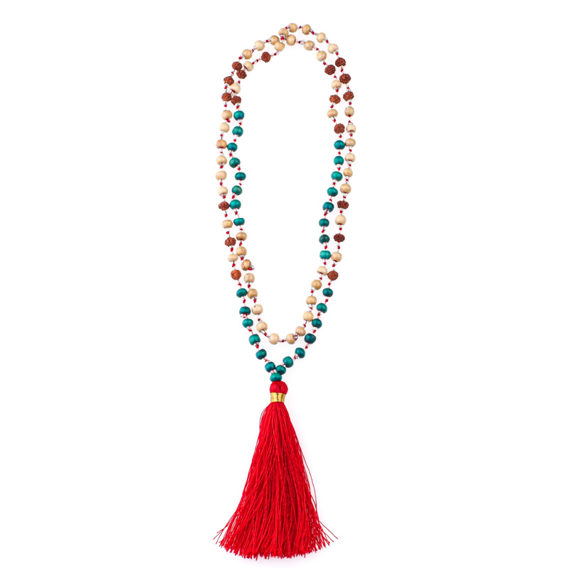 Překrásná mala se zářivě červeným střapečkem se skládá z tradičních korálků ze semen Rudraksha a dřevěných korálků v tyrkysové a světlé přírodní barvě, je vyrobená ručně na exotickém ostrově Bali. Jednotlivé korálky maly jsou odděleny uzlíkem a dvěma drobnějšími průhlednými korálky pro snadnější posunování mezi prsty. Uzlíky symbolizují pečlivost a trpělivost, usnadňují pohyb korálků mezi prsty při meditaci a mají také praktický význam – pokud se mala přetrhne, neztratíte žádný z korálků a lze je znovu navléknout.