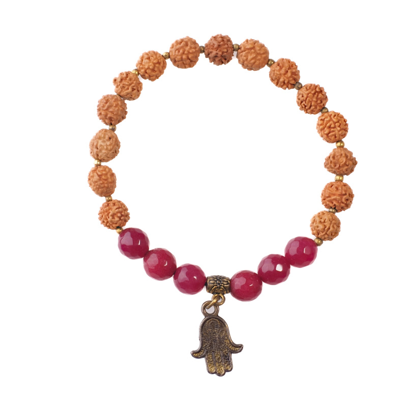 Něžný náramek je ručně vyroben na exotickém ostrově Bali z posvátných semen Rudraksha, fialových korálků a ozdobený kovovým přívěskem Hamsa. Rudraksha je oblíbeným materiálem pro výrobu tradičních buddhistických růženců, zvaných Japa Mala (Thengwa). Nyní můžete mít tyto magické korálky stále u sebe ve formě elegantního náramku.