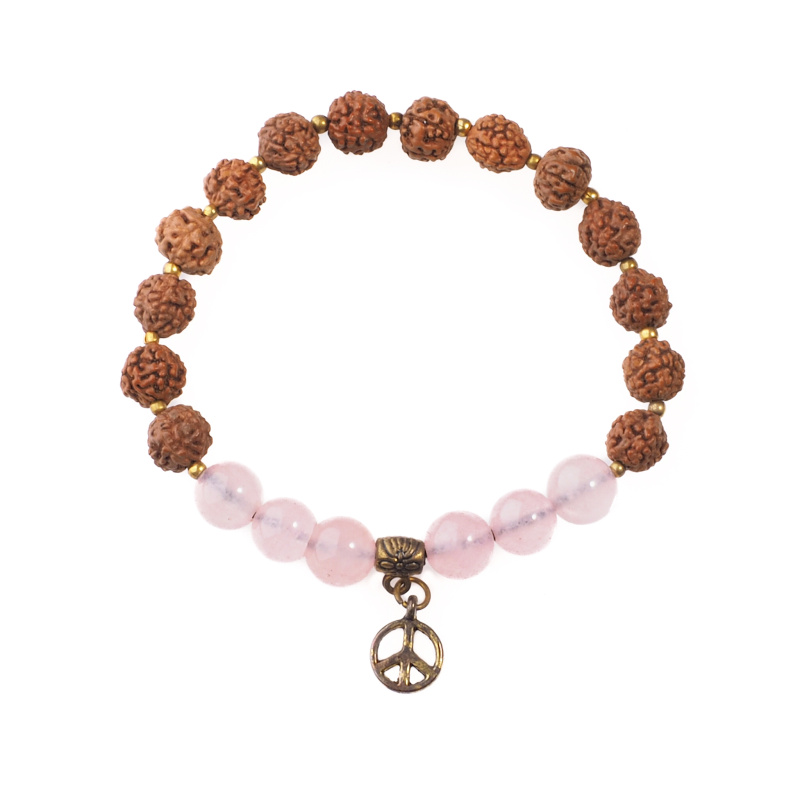 Něžný náramek je ručně vyroben na exotickém ostrově Bali z posvátných semen Rudraksha, růžových korálků a ozdobený kovovým přívěskem Peace. Rudraksha je oblíbeným materiálem pro výrobu tradičních buddhistických růženců, zvaných Japa Mala (Thengwa). Nyní můžete mít tyto magické korálky stále u sebe ve formě elegantního náramku.