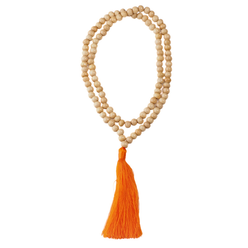 Na exotickém ostrově Bali ručně vyráběná tradiční mala ze světlých dřevěných korálků zdobená oranžovým střapečkem.