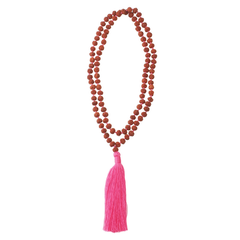 Na exotickém ostrově Bali ručně vyráběná tradiční mala ze semen Rudraksha zdobená růžovým střapečkem.