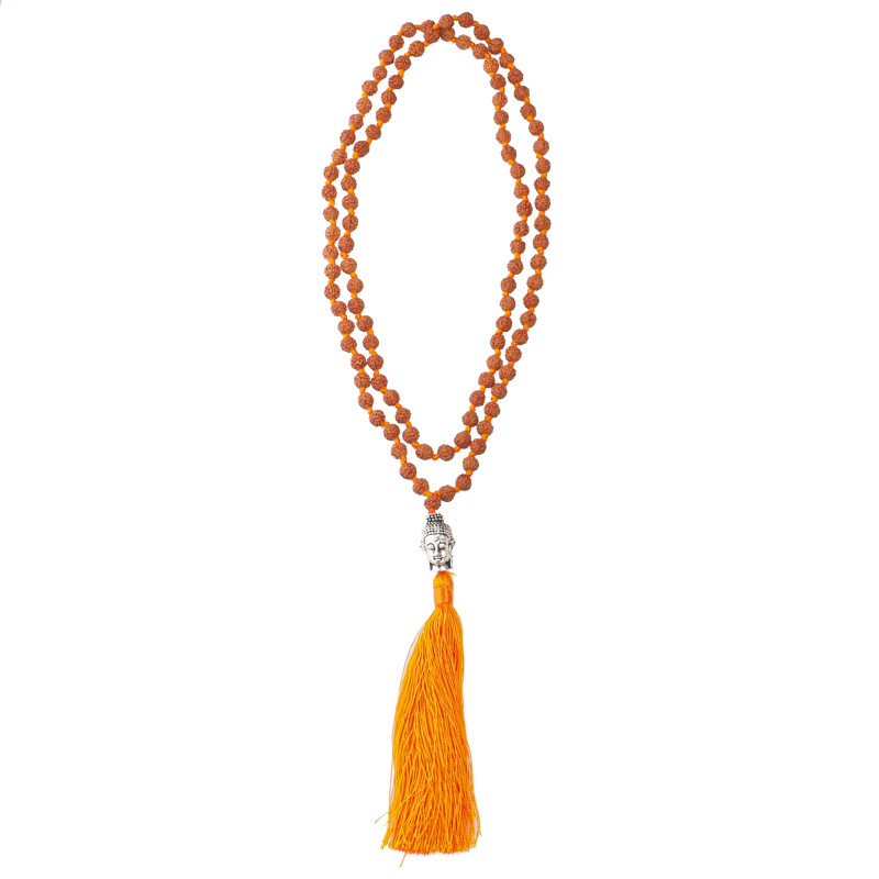 Na exotickém ostrově Bali ručně vyráběná tradiční mala ze semen Rudraksha zdobená kovovým prvkem ve tvaru hlavy Buddhy a oranžovým střapečkem.