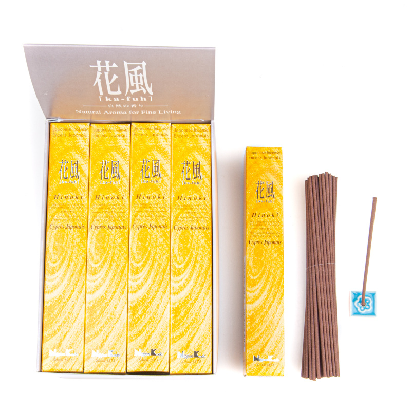 Japonské vonné tyčinky Nippon KAFUH Hinoki, to jsou velmi oblíbené vonné tyčinky se svěží lesní vůní, vhodné pro každý den. Tyto univerzální tyčinky jsou vhodné pro každého, i pro ty, jež pálení vonných tyčinek příliš neholdují. Vonné tyčinky Hinoki se dají dobře využít v malých prostorách pro svoje neagresivní vonné vlastnosti. Výborně se hodí k nastolení harmonie a klidu.